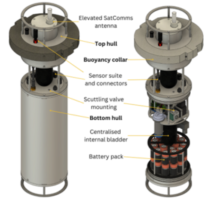 • Sensors: Temperature, pressure and conductivity, echo sounder (to measure bathymetry) and a hydrophone (to measure the ambient noise)